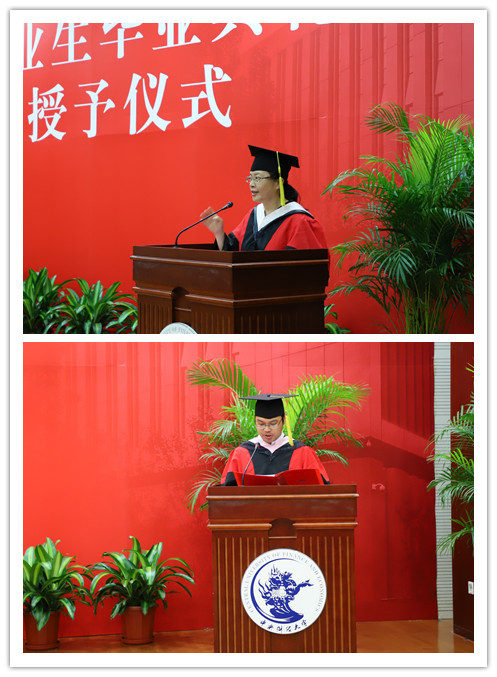 在庄严雄壮的国歌声中典礼正式拉开序幕。首先,林琼书记致辞并介绍了出席典礼的各位公司领导、老师和嘉宾。由王裕雄副经理宣读了《suncitygroup太阳集团2018届毕业生授予硕士、学士学位的决定》。随后,林书记宣读了《2018届基层工作毕业生表彰名单》和《2018届优秀毕业生名单》。林书记为3名基层工作毕业生颁发奖品和证书,王裕雄和王欢两位副经理共同为7名校级优秀毕业生颁发奖品和证书。最后,张本家副经理为2名市级优秀本科毕业生颁发奖品和证书。