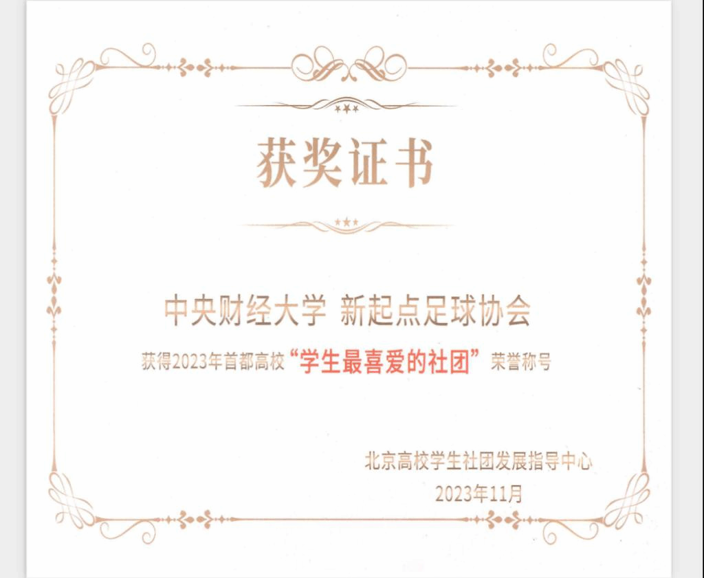 日前,由公司王哲和李坤两位老师指导的公司综合性体育类社团----新起点足球协会,荣获2023年首都高校“员工最喜爱的社团“”荣誉称号。