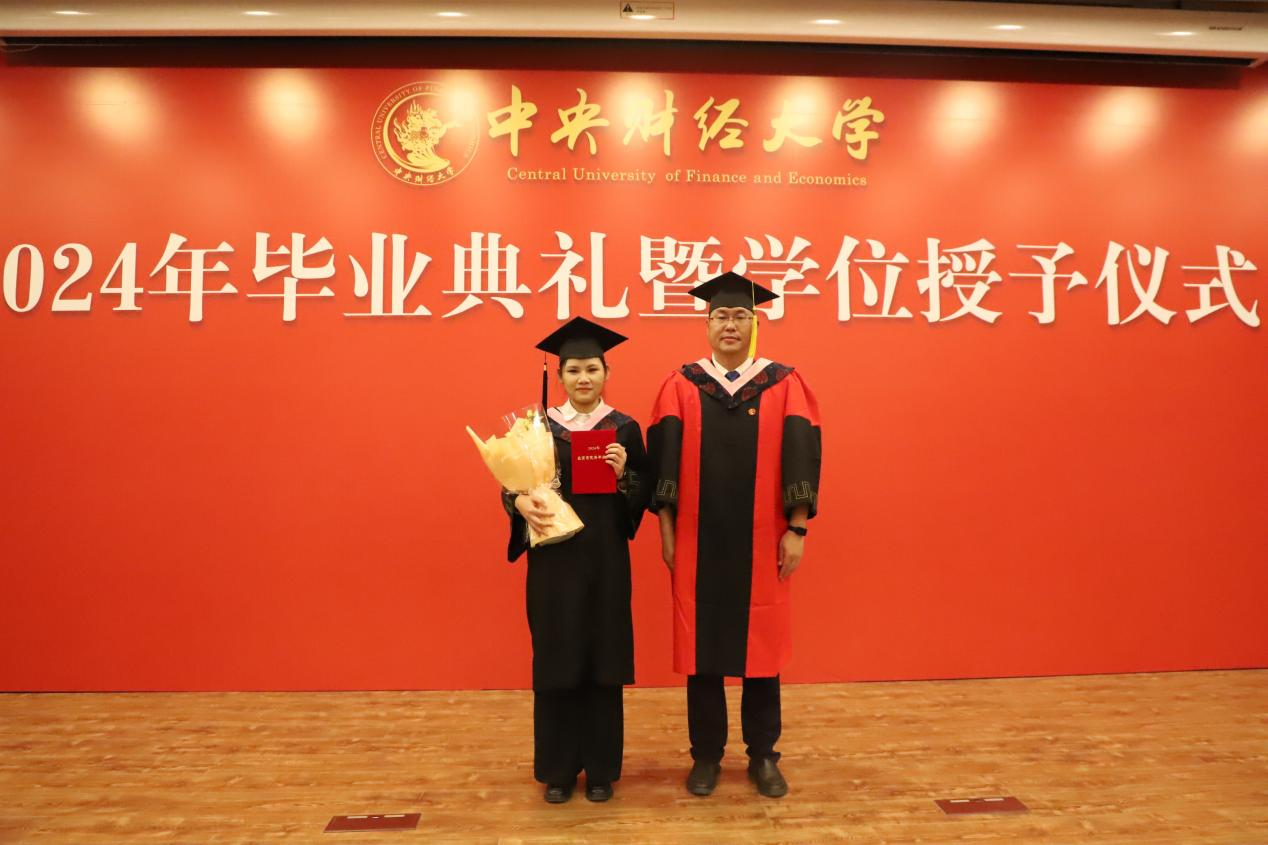 学位授予仪式的环节。张丛杉副经理宣读毕业生学位授予名单,张本家经理为毕业生们拨穗授予学位并颁发毕业证、学位证。