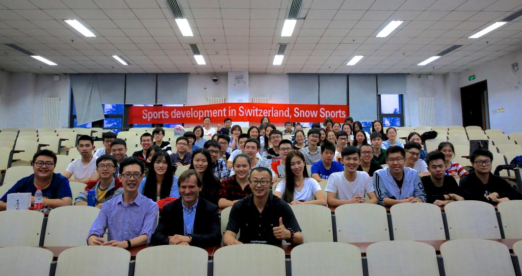随后,公司在东区主教218举行了主题为“Sports development in Switzerland,Snow Sports”的讲座,公司李宏权、马越老师和沙河校区全体同学共同聆听了此次讲座。讲座由张丛杉老师主持,Stricker博士围绕冰雪运动这一冬季体育项目向我们介绍了瑞士冰雪运动的发展状况,同时也详细地介绍了隶属于洛桑理工大学(EPFL)的瑞士国际体育管理与科技研究院(AISTS)概况。