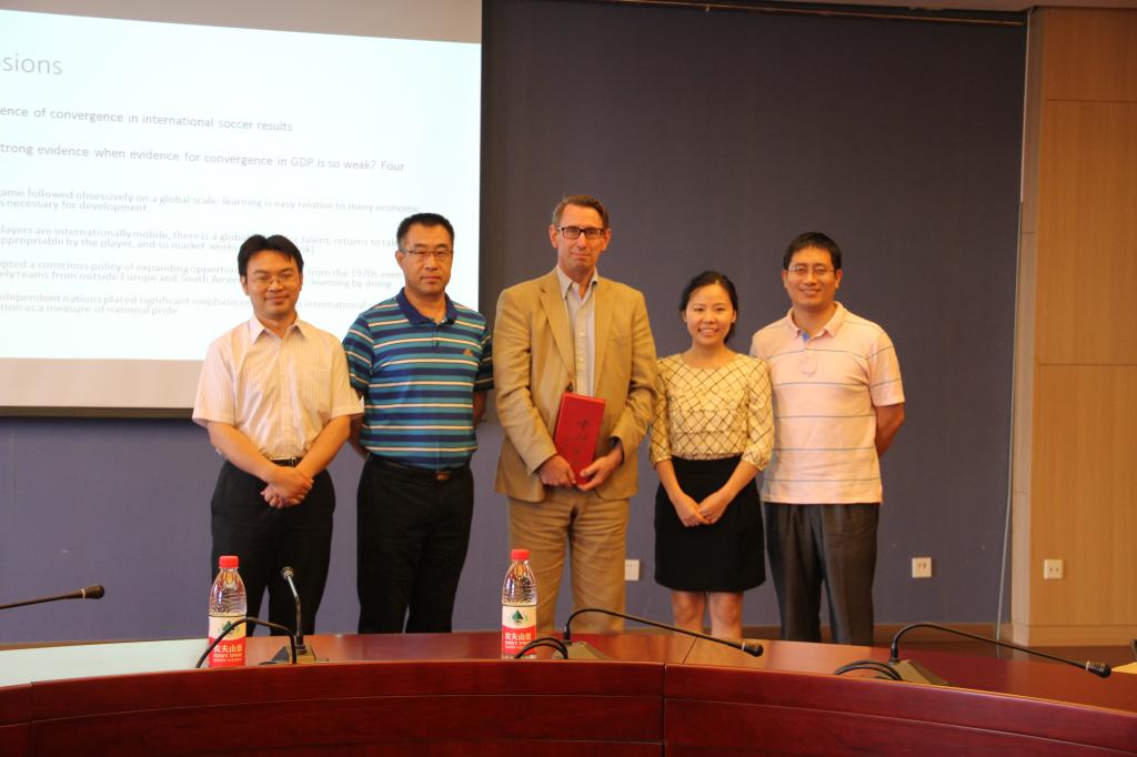 本次交流主题是对Dr.Stefan Szymansk的研究成果“convergence and soccer“的探讨。首先,Stefan Szymansk教授从研究意义、研究方法等方面介绍了自己的研究及得出的研究成果。之后,与会学者围绕这一研究成果展开讨论,高度评价了这项研究的价值和创新之处,并且就研究的方法和数据计算、国家足球队竞赛成绩的影响因素、足球世界存在收敛现象的原因、构建相关理论和模型的设想,以及中国足球的发展等问题展开了热烈的讨论。