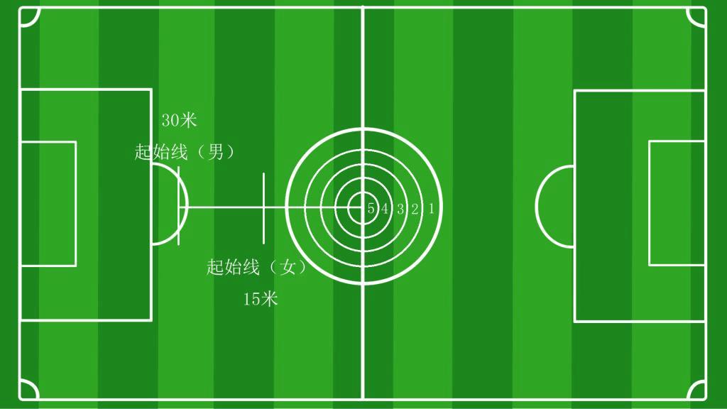 每队15名队员参赛,至少5女。每队15名队员在起始线后依次将球踢入规定区域(足球场中圈),各区域赋予不同分值(1-5分),每人三次机会,取15人的三次成绩总和为本队最终成绩,总分高者名次居前。