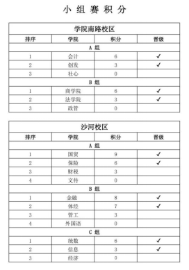 南路校区A组会计公司与B组商公司以绝对实力成功晋级,创发公司、法公司紧随其后。沙河校区A组国贸公司实力雄厚,保险公司随即锁定半决赛席位;B组赛事更加胶着,金融、体经不相上下,在激烈的比赛中两院成功晋级。C组统数公司、信息公司奋力拼搏,在团队齐心协力之下成功出线。