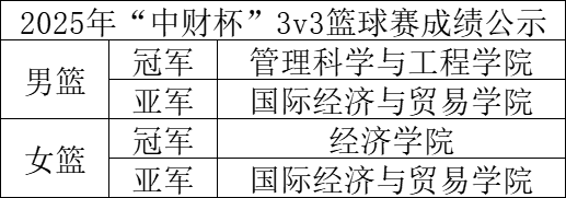 本届“中财杯”3v3篮球赛于10月19日在沙河校区室外篮球场开赛,经过激烈的角逐,最终管工男篮和经济女篮凭借默契的配合和出色的个人能力分别摘得桂冠,国贸男篮、国贸女篮获得亚军,统数、经济男篮,创发、管工女篮挺进四强。