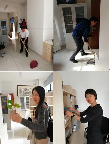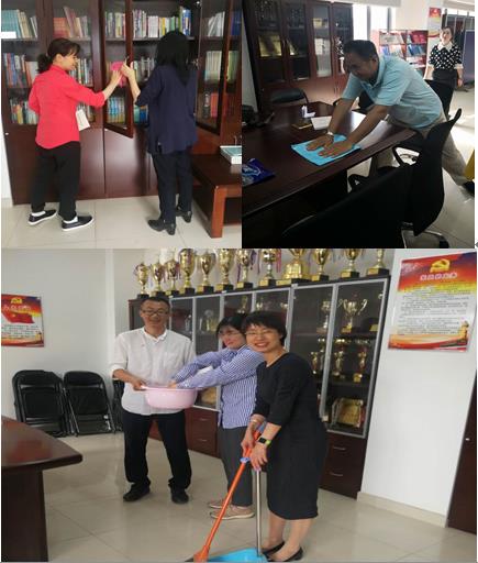 5月15日下午,专业课教工党支部开展了“践行冬奥理念、环境友好从我做起”的主题活动。专业课教工办公地点为沙河体育场看台用房,由于体育场看台的特殊建筑结构,办公用房呈狭窄的长形结构。比如,教师教研室,就需要在20平米左右的办公用房里放置8张电脑桌。由于紧临地铁和外部交通要道,办公室窗户、柜子、办公桌以及地面常年被尘土覆盖。