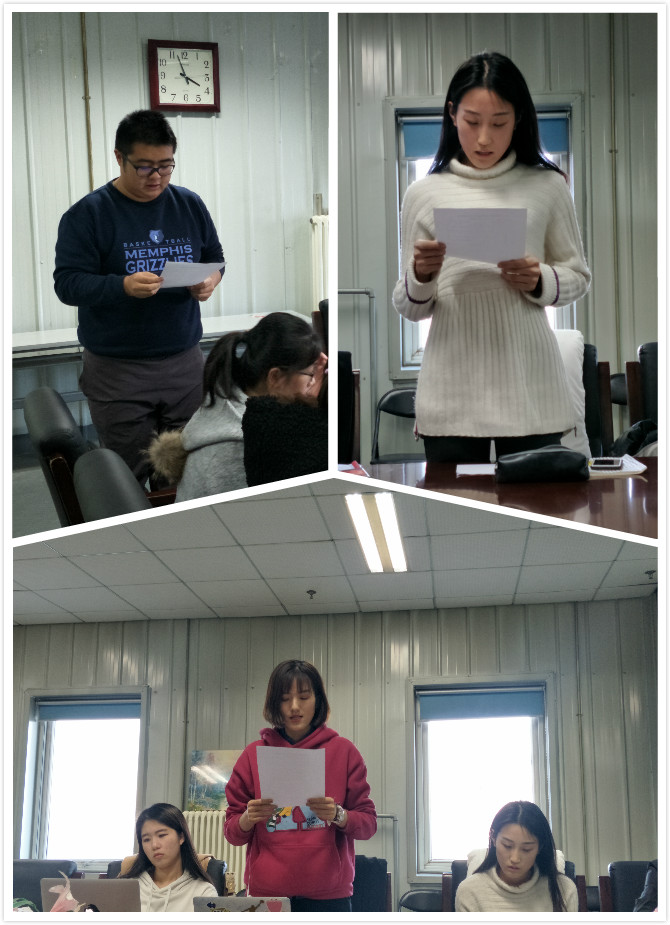随后,以“党支部书记领读+全体朗读”的形式,第二党支部全体成员共同饱含深情的朗读了一首纪念“一二·九”运动的诗歌。“华北,一个在战乱中被拐走的孩子,在绝望地,嘶声竭底地哭泣,妈妈,我不要离开您!”,“在中国,只要有硝烟,就有勇土;在中国,只要有危难,就有脊梁;在中国,只要有青年,就有希冀”。诗歌的描写真实,诵读完毕,全体成员备受鼓舞,为历史所动容,纷纷发表自己的看法和承诺。