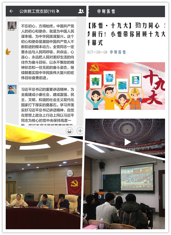 由沙河校区员工担任编辑的公司员工工作公众号“中财·体悟”联合第二员工党支部的其他党员同学,向全院员工推送了一篇《勠力同心 筑梦前行!小悟带你回顾党的十九大开幕会》的文章,文章的主题是“青春瞩目党的十九大”体现了同学们密切关注党的十九大的盛况。