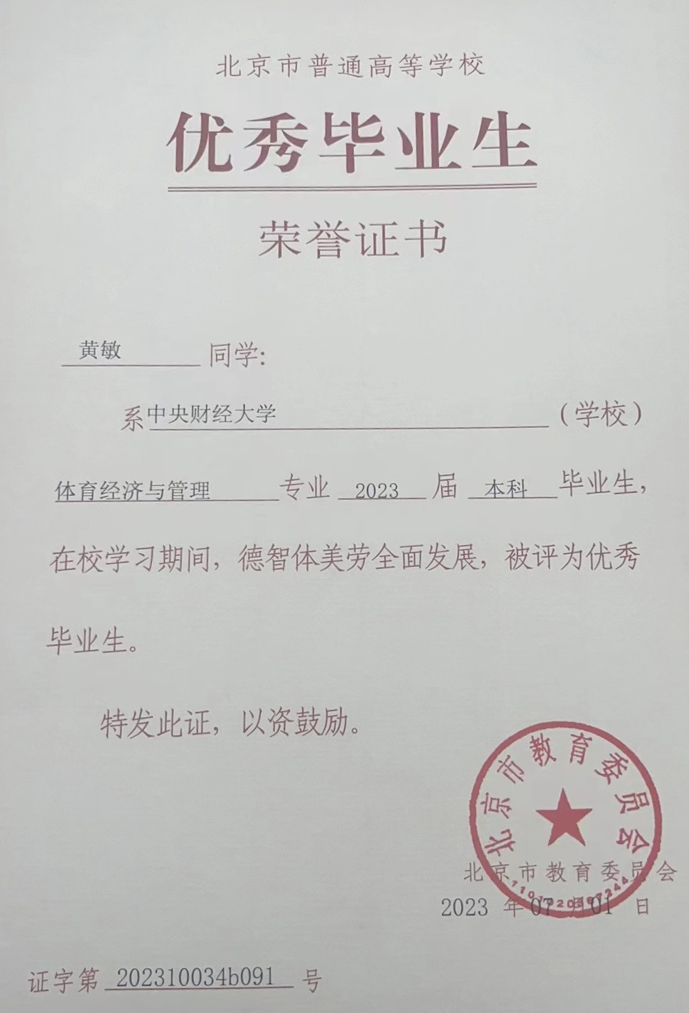 努力学习,追求卓越是每一个中财大学子的奋斗目标。黄敏学习态度端正,学习成绩良好,加权平均分91+,保研至suncitygroup太阳集团。此外,黄敏同志热切关注时事,对科研工作充满热情。大学期间参编《体育产业蓝皮书》报告,一篇英文论文成功发表,一篇中文论文获得挑战杯论文优秀奖,同时参与《新工科背景下体育产业创新创业教育课程体系建设研究》《2022年北京冬奥会经济转型研究》等多个课题。