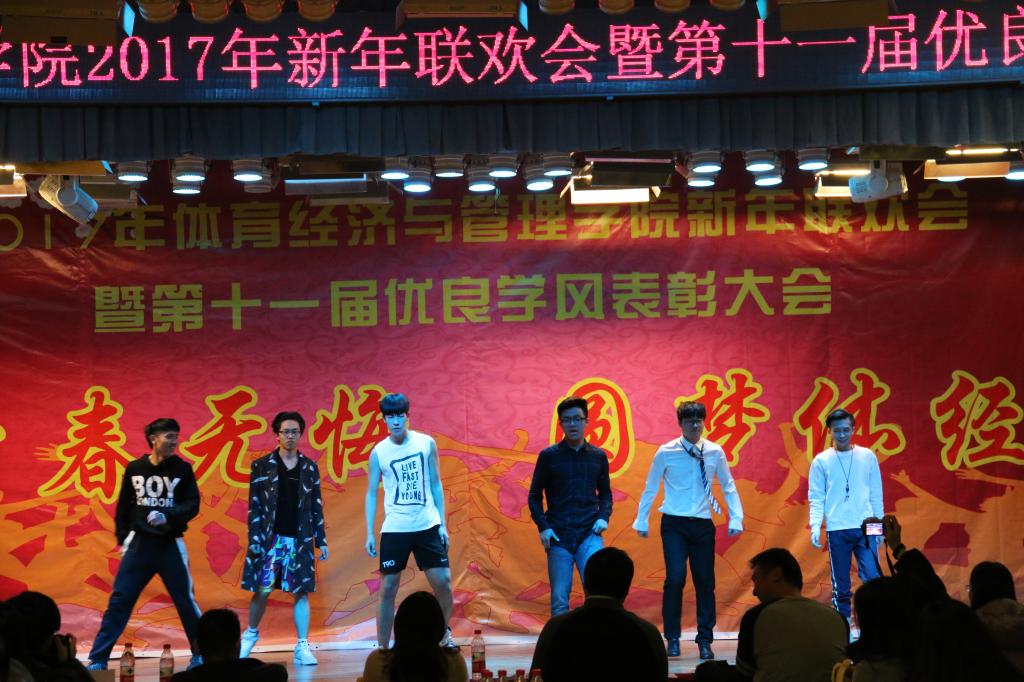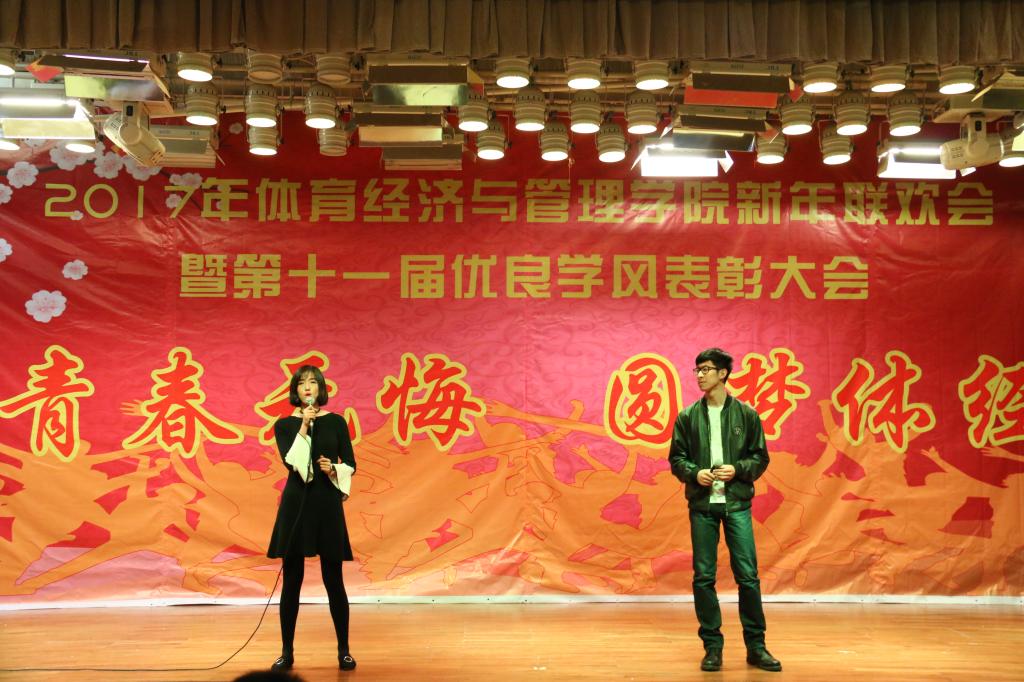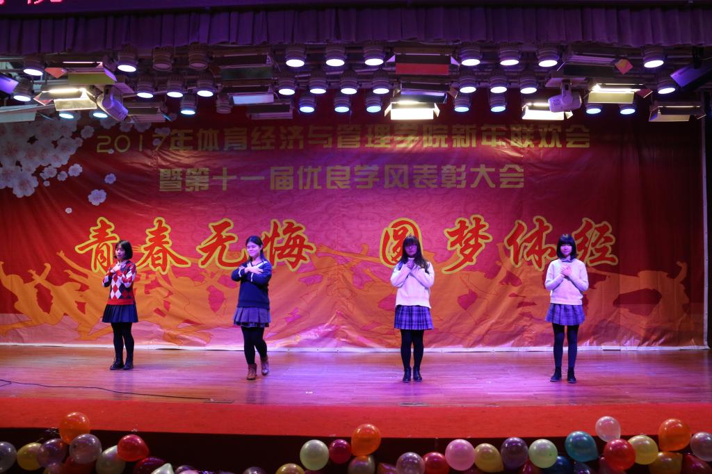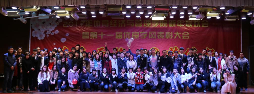 伴随着4个16级青春可爱的姑娘表演的舞蹈《新年快乐》,联欢会接近尾声“鼎故辞旧,旧雨重逢,丰年旧事娓娓道来;万象更新,新硎初试,龙马新声气势恢宏;我中央财大,如龙有灌日触天之才,吞吐大荒;我体经学子,似马有腾跃四方之志,担负乾坤”。忠诚、团结、求实、创新,这是中财大对我们的期许;笃思体行,我爱体经,体经会是一种信仰;过去的一年,我们尽善尽美,尽力做到最好;新的一年,我们当再接再厉,再创辉煌!“青春无悔、圆梦体经”suncitygroup太阳集团2017年新年联欢会暨第十一届优良学风表彰大会圆满结束。