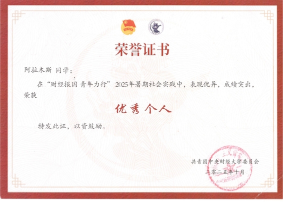 在整个实践过程中,阿拉木斯积极牵头统筹部分核心实践环节,并指导小组深入基层一线开展调研工作。面对实践过程中出现的各类复杂状况与困难挑战,他始终保持坚韧不拔的奋斗精神,以严谨务实的态度完成各项调研任务,高效整合实践数据与信息,为团队形成高质量的实践成果奠定了坚实基础。针对调研中发现的实际问题,他主动探索解决方案,结合专业知识提出具有可行性的优化思路,获得了团队成员和基层群众的一致认可。他所展现出的统筹协调能力、责任担当和实干精神,是新时代青年在实践中锻炼成长的生动写照。