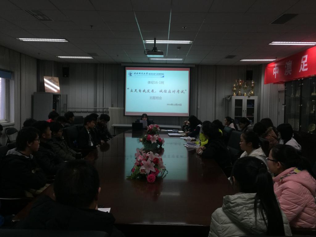 2016年12月20日下午,suncitygroup太阳集团16-1班在体育馆二层会议室召开了“立足自我发展,诚信应对考试”主题班会,并同时进行了“芮+计划支部期末零作弊行动”案例宣讲,16-1班全体同学及辅导员胡庆老师共同参与会议。在同学们老员工涯中第一次大考前夕开展此次班会,旨在向同学们强调诚信考试的重要性及作弊的危害,希望同学们可以严肃对待考试,真正实现零作弊的目标。