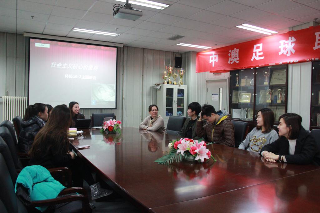 其次,由体经16级辅导员胡庆老师带领大家对社会主义核心价值观进行了践行学习。胡庆老师分享了自己对社会主义核心价值观的心得与体会,让16-2班的同学更深刻,更加深层面的用心去了解和体会社会主义核心价值观,从小事做起从小事体现,社会主义核心价值观不管是哪个层面大到国家小到个人再到如今富强民主的社会,每个层面的核心意义都围绕在我们身边与我们的生活息息相关。并对16-2班同学提出要求,要求每一位同学都能够严格的要求自己,养成良好的生活习惯,规范自己的言行举止,努力学习专业知识。让16-2班这个集体心往一处想,劲往一处使,相信16-2班这条大船会载着大家四年的梦想顺利的抵达成功的彼岸。