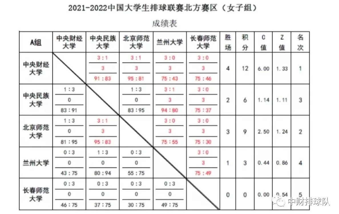 小组赛阶段,第一场面对实力强劲的中央民族大学女排,中财女排在赛前仔细研究分析对手的前提下充分落实技战术部署,保持高昂的情绪,以3:1赢得胜利。随后,中财女排一鼓作气以3:1再次战胜阵容齐整、配合熟练的北京师范大学女排,又连续两场小组赛以3:0战胜兰州大学女排和长春师范大学女排,连胜四场以小组第一的成绩进入交叉赛。